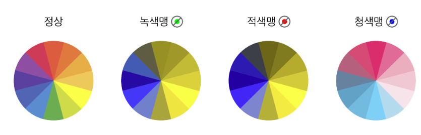 *적색 - 녹색 색각 결함과 청색 원뿔 단색 색각의 경우입니다.