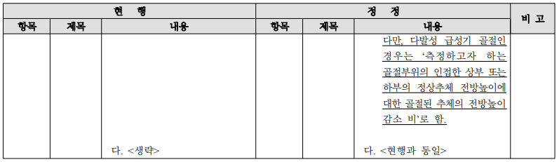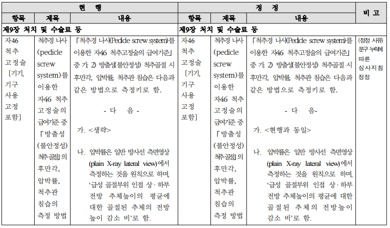 | 정정 | 척추경 나사(pedicle screwsystem)를 이용한 자46 척추고정술의 급여기준 중 「방출성(불안정성) 척추 골절」의 후만각, 압박률, 척추관 침습의 측정 방법 | 일부 문구 누락 정정 |