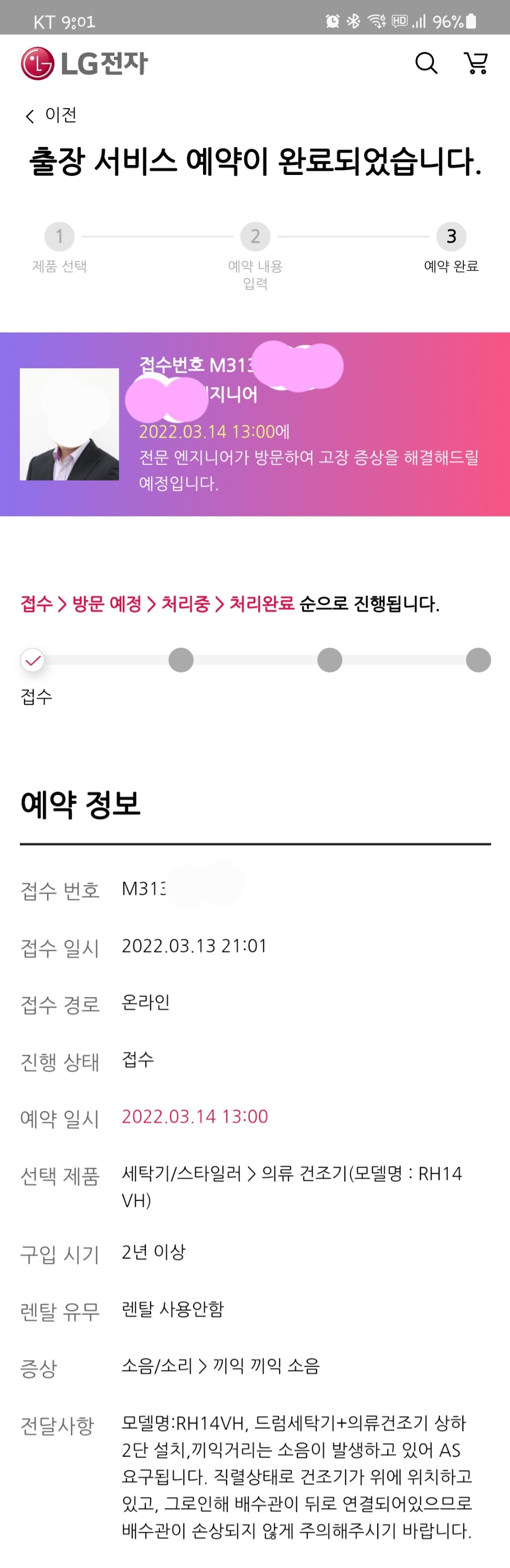 먼저 검색한 후 서비스센터 가전제품-> 건조기-> 건조기 모델명 입력-> 증상 입력을 하고 나면 다음과 같은 완료 화면이 뜹니다.