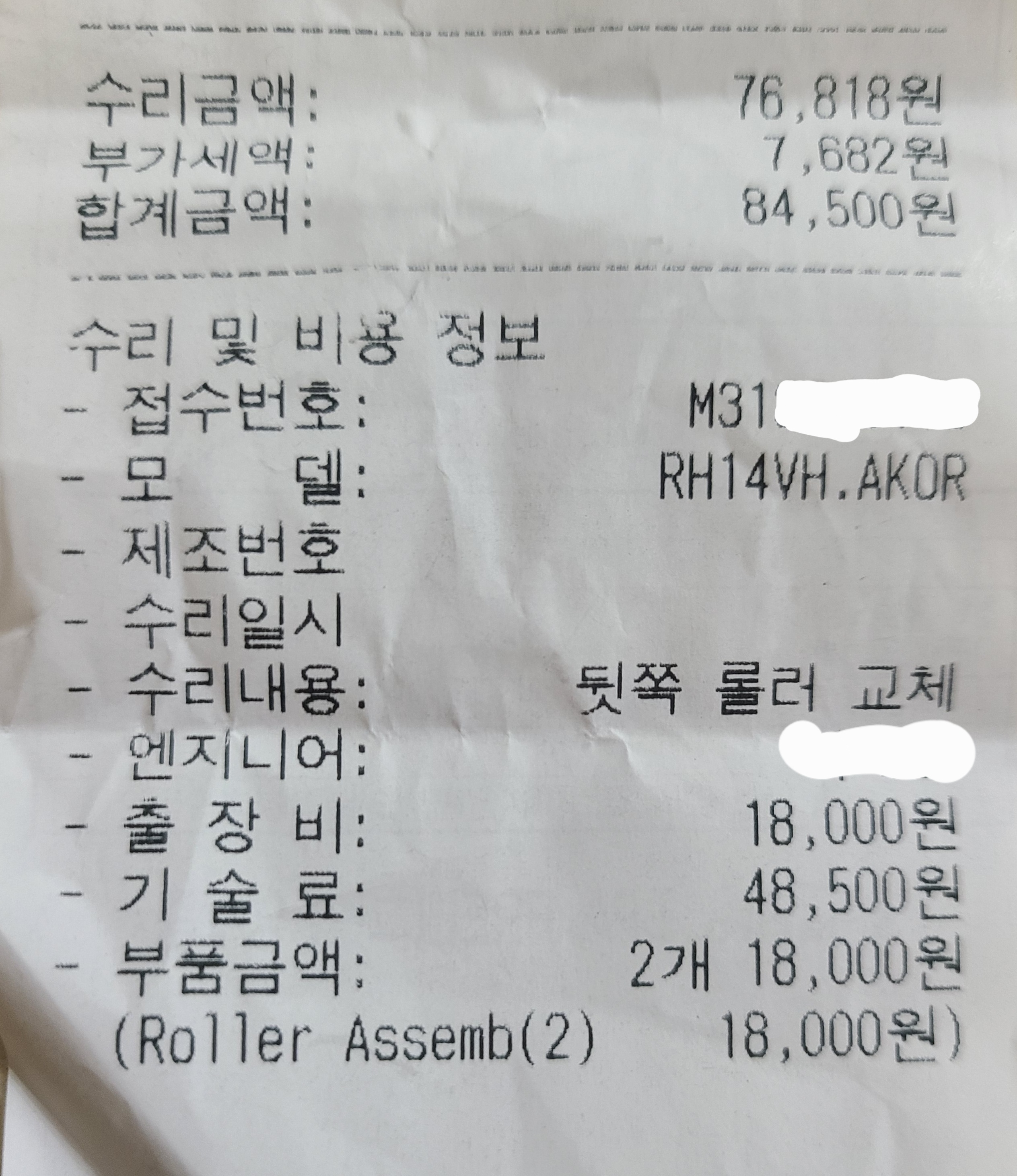 비용은 롤러 두 개 18,000원에 기술료 48,500원, 그리고 출장비 18,000원까지 합이 84,500원이었습니다.