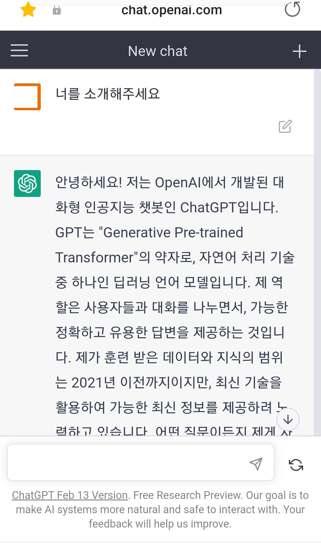 너를 소개해주세요.라고 입력하니, 설명을 열심히 해줍니다.