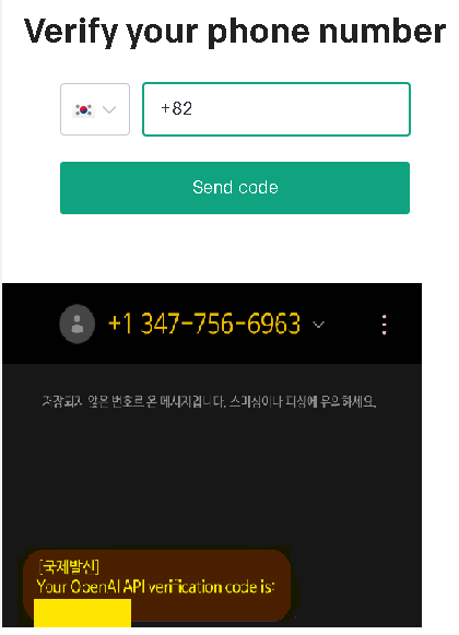 국가는 한국으로 선택하고 'Send code'를 눌러 휴대폰 번호로 수신된 인증코드를 입력해줍니다.
