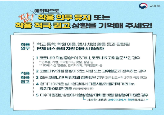 통학차량 등에서는 의무적으로 마스크를 착용해야 하며, 의심 증상이 있거나 고위험군인 경우, 확진자와 접촉한 경우 등은 마스크를 착용해야 합니다.