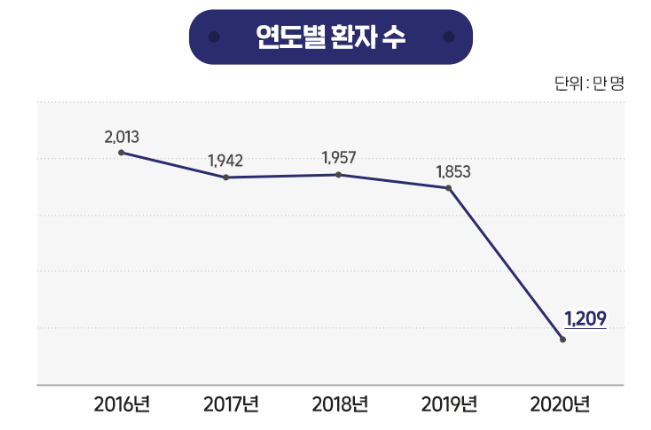 [출처] 건강보험심사평가원 생활속질병진료행위 통계 https://www.hira.or.kr/bbsDummy.do?pgmid=HIRAA020045010000&brdScnBltNo=4&brdBltNo=2361#none