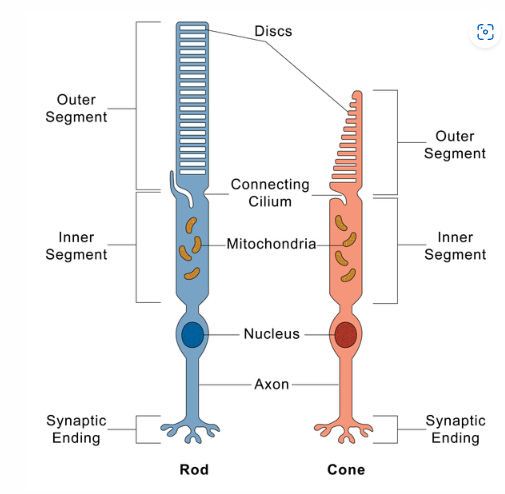 *망막에는 눈에서 뇌로 시각 신호를 전달하는 간상체와 원뿔체(rods and cones)라고 하는 두 가지 유형의 광 수용체 세포가 있습니다.