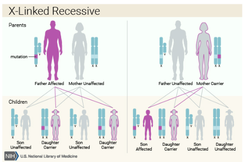 따라서, 남성은 여성보다 X-연관 열성 장애의 영향을 훨씬 더 자주 받는데, 이는 여성(두 개의 X 염색체를 가진)의 경우 장애를 일으키기 위해 염색체의 두 사본 모두에서 유전적 변화가 일어나야 하기 때문입니다.