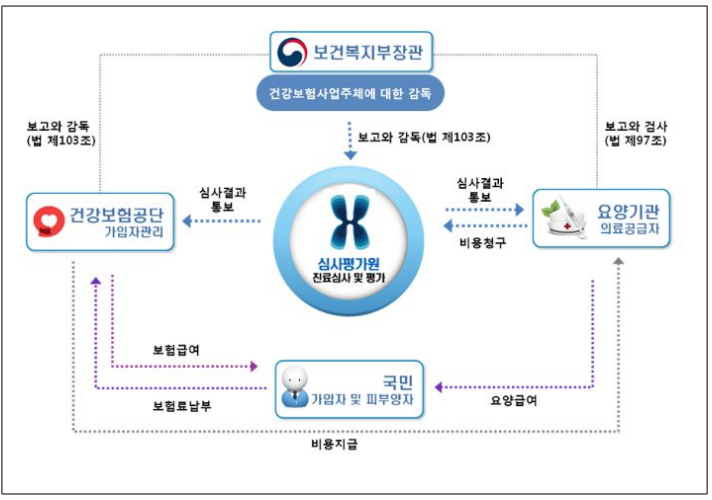 「국민건강보험법」에서는 요양급여비용의 심사 및 요양급여의 적정성 평가 등 업무를 수행하는 심사평가원, 국가를 대신하여 건강보험사업을 수행하는 관리운영주체로 가입자 등에 대한 자 격관리 및 보험료 부과ㆍ징수 등 업무를 수행하는 공단, 가입자 등에 대한 요양급여를 담당하는 요양기관을 각각 건강보험 관리운영주체로 규정하고 있으며, 심사평가원ㆍ공단 및 요양기관은 국민건강증진이라는 「국민건강보험법」의 입법목적을 달성하기 위하여 ʻ대등한 당사자ʼ로서 법상 부여된 고유 업무를 수 행한다.
