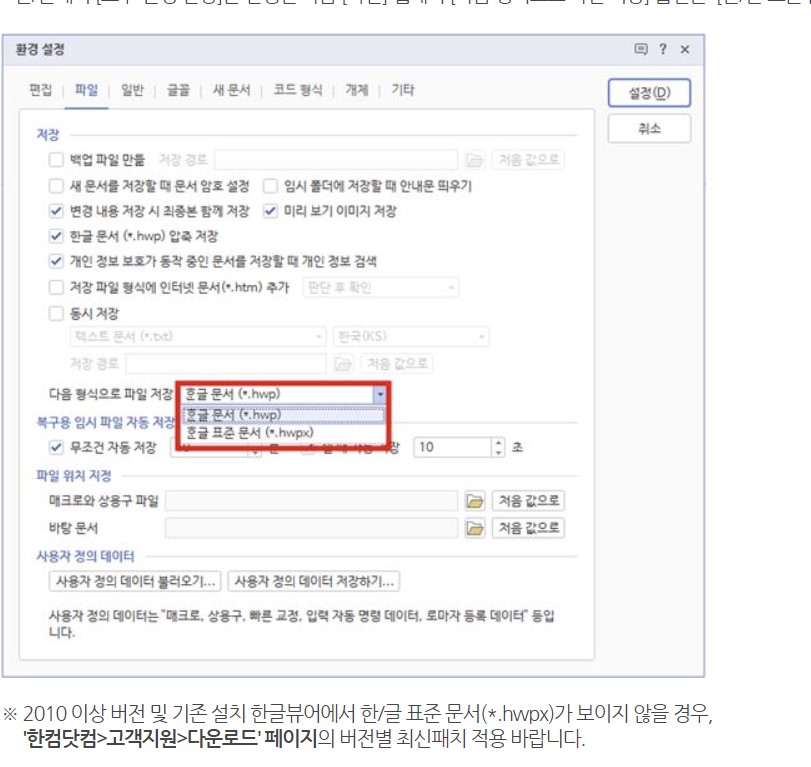 생각해보니 이걸 한컴에서 그대로 둘리 없고, 내 한글 환경설정을 보니 떡하니 형식이 호환됨을 발견!