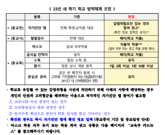 이에 따라, 자가진단 앱 등 일부 방역 지침이 완화되거나 폐지되지만, 코로나19 종식까지 위험 요인이 남은 만큼 필수적·기본적 방역조치는 당분간 유지한다는 것이 교육부의 방침이다.
