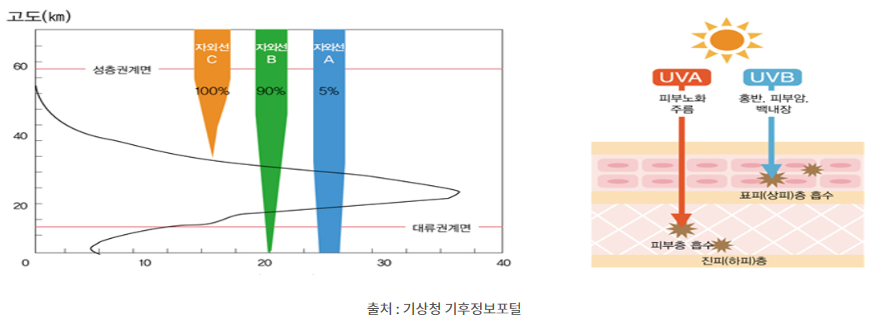 [(좌) 성층권에서 자외선 흡수량 (우) 자외선 A와 자외선 B의 피부 침투 정도]